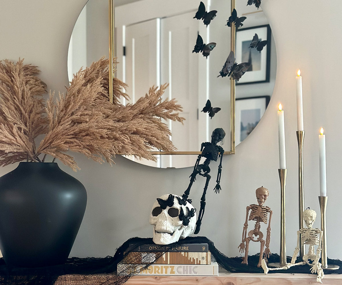 Ideas on where to style your skellies : bar cart, entry table, front porch or even a centerpiece to your dining table.